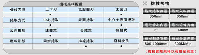 基本放料形式:連體式活動機座,加裝自動對邊裝置,成品邊面整齊,生產順利。